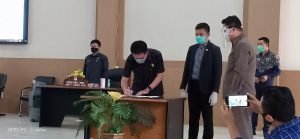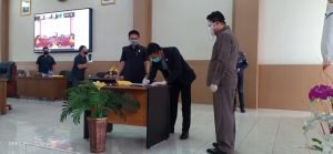 Diakhir paripurna wakil ketua DPRD Paulman S Runtuwene,SE bersama Stevanus Lumowa,SE,menandatangani Surat Keputusan susunan Pansus LKPJ Bupati tahun 2019 yang disaksikan langsung Bupati DR.Christiany E Paruntu,SE dan Ketua DPRD Jenny J Tumbuan,SE via Vicon.