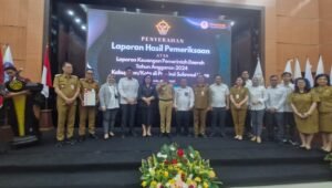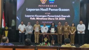 Bertempat di Kantor Badan Pemeriksaan Keuangan (BPK) Republik Indonesia perwakilan Sulawesi Utara (Sulut) di Jln 17 Agustus Manado, Bupati Joune Ganda menerima Laporan Hasil Pemeriksaan (LHP) BPK atas Laporan Keuangan Pemerintah Daerah (LKPD) khususnya Pemerintah Kabupaten (Pemkab) Minahasa Utara (Minut) Tahun anggaran 2024, Senin (26/05/2025).