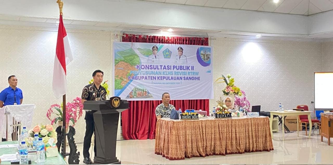 LIPUTAN15.COM,SANGIHE – Bupati Kepulauan Sangihe, Michael Thungari, secara resmi membuka kegiatan Konsultasi Publik II Penyusunan Kajian Lingkungan Hidup Strategis (KLHS) Revisi Rencana Tata Ruang Wilayah (RTRW) Kabupaten Kepulauan Sangihe Tahun 2014–2034, Kamis (02/10/2025), bertempat di Ruang Serbaguna Rumah Jabatan Bupati.