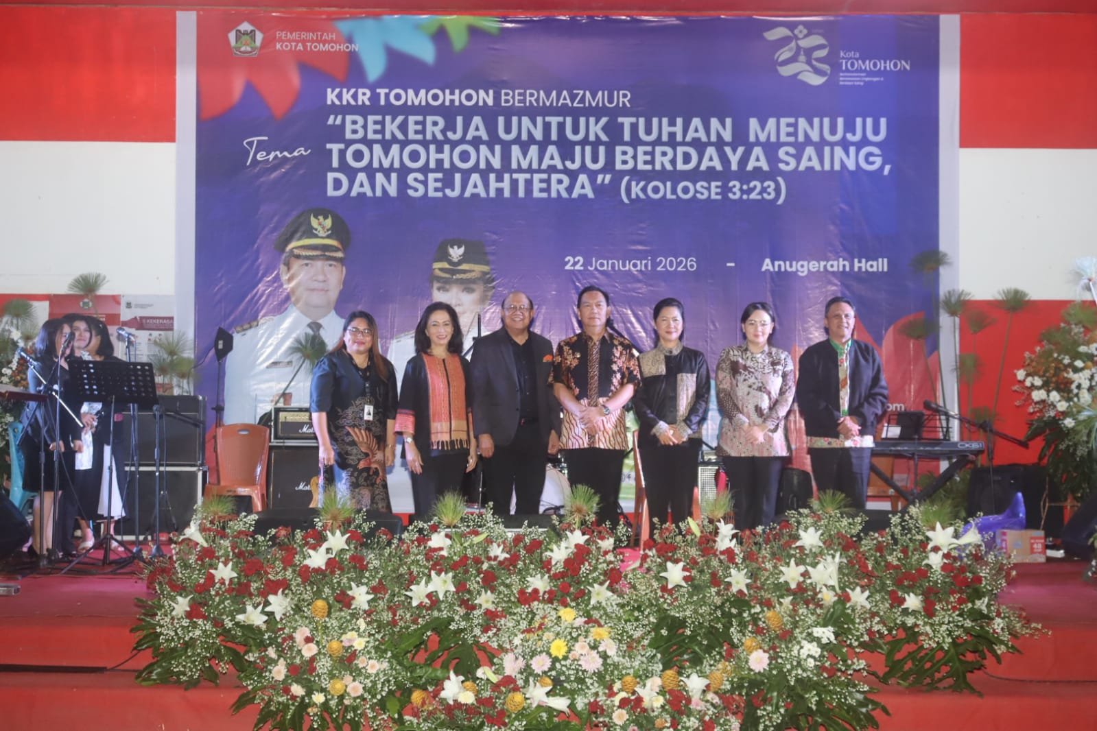 TOMOHON—Wali Kota Tomohon, Caroll J. A. Senduk, S.H., didampingi Ketua TP-PKK Daerah Kota Tomohon drg. Jeand’arc Senduk-Karundeng, bersama Wakil Wali Kota Tomohon Sendy G. A. Rumajar, S.E., M.I.Kom., menghadiri Kebaktian Kebangunan Rohani (KKR) Tomohon Bermazmur dengan tema “Bekerja untuk Tuhan Menuju Tomohon Maju, Berdaya Saing, dan Sejahtera” (Kolose 3:23), Kamis (22/1/2026).
