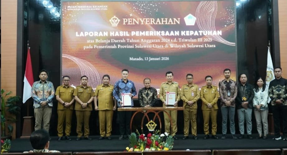 Penyerahan Laporan Hasil Pemeriksaan (LHP) Semester II Tahun 2025 oleh Badan Pemeriksa Keuangan (BPK) RI Perwakilan Sulut digelar di Manado Selasa (13/1/2026), dihadiri Wakil Gubernur J. Victor Mailangkay wakili Gubernur Mayjen TNI (Purn) Yulius Selvanus.