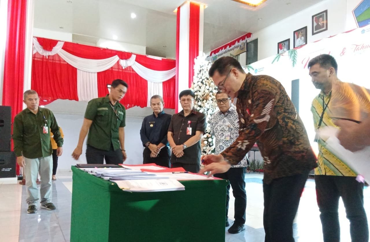 Bupati Joune Ganda tandatangani Nota Kesepakatan Pengelolaan Sarana Prasarana Air Baku Likupang Tahap I (KSPN Manado-Bitung) dan TPA Sampah Regional Mamitarang Sulawesi Utara, Jumat 6 Februari 2026, di Atrium Kantor Bupati Lt.1.
