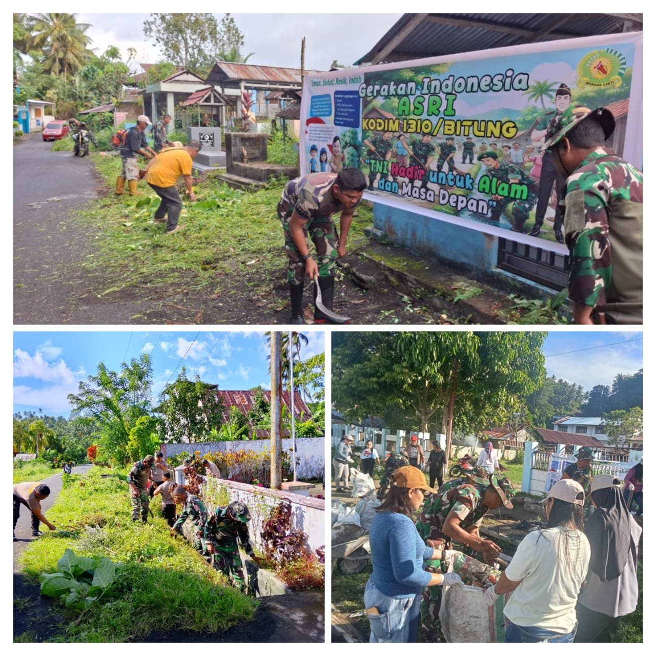 Koramil 1310-04/Dimembe sapu halaman Balai Desa Laikit, hadir Kadis Bappeda Minut.Koramil 1310-05/Kauditan pangkas dahan pengganggu jalan Desa Lilang, Kec. Kema, bersama Polsek Kema. Terakhir, Koramil 1310-06/Airmadidi bersihkan TPU Sarongsong 1, termasuk saluran air.