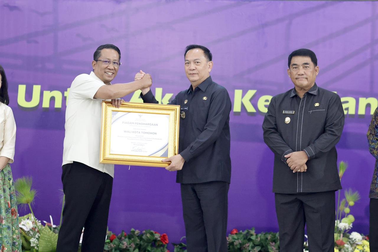 TOMOHON– Wali Kota Tomohon, Caroll J A Senduk, menyabet piagam penghargaan langsung dari Menteri Hukum dan HAM RI, Supratman Andi Agtas, atas kontribusi luar biasa dalam pembentukan 1.839 Pos Bantuan Hukum (Posbankum) di seluruh desa dan kelurahan Sulawesi Utara.