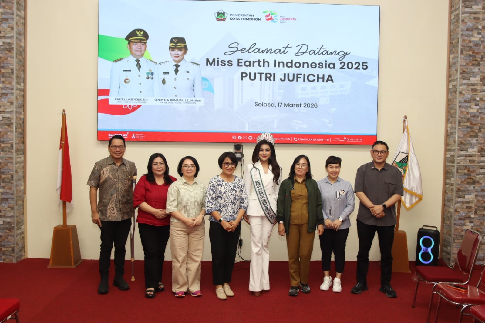 TOMOHON– Putri Andriani Juficha, Miss Earth Indonesia 2025 asal Sulawesi Utara, hadir penuh pesona di Command Center Pemkot Tomohon.