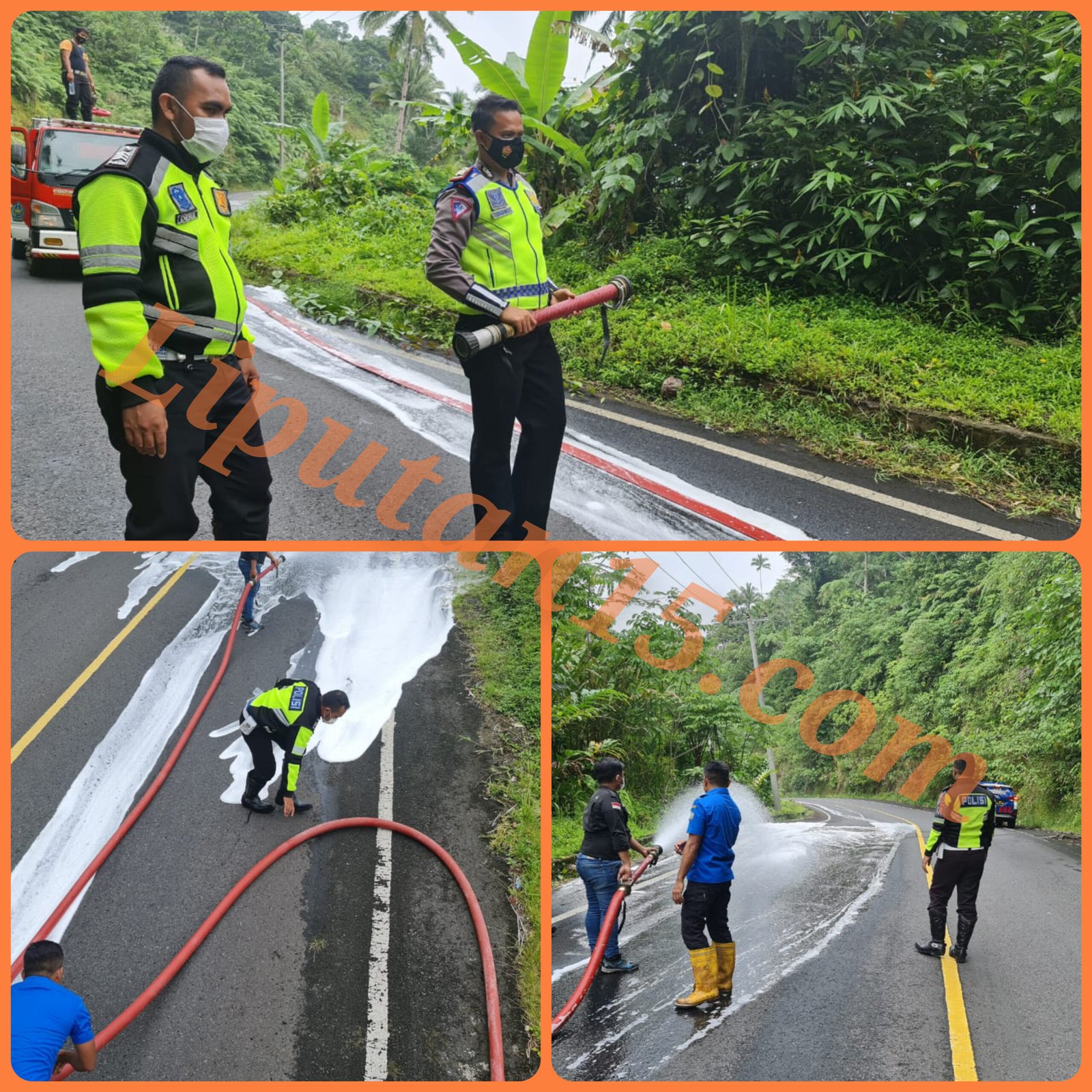 Kasat Lantas Sangihe pimpin Pembersihan tumpahan Solar di ruas Jalan arah Tahuna – Lenganeng